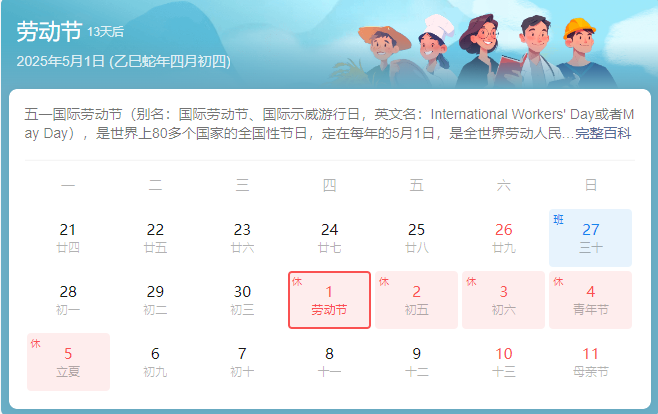 一、放假时间:2025年5月1日-5月5日,4月27日调休补班,5月6日正常上班。请回家或出行员工提前购置好往返车票。